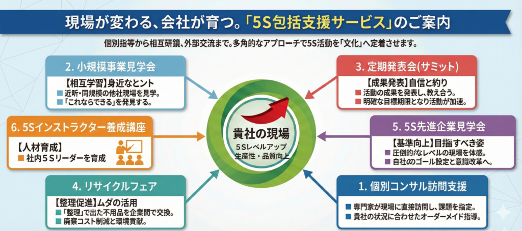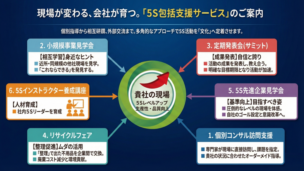 足利5S学校では、「5Sインストラクター養成講座」「定期発表会(サミット)」「小規模事業見学会」「リサイクルフェア」など、会社規模に関係なく、多方面から皆様の5S活動をサポートをする事業を行っております。「個別指導」で自社の基礎体力をつけつつ、「見学・交流・発表」という外部との関わりを通じてモチベーション維持とレベルアップを図る、理想的な5S推進サイクルとなっております。