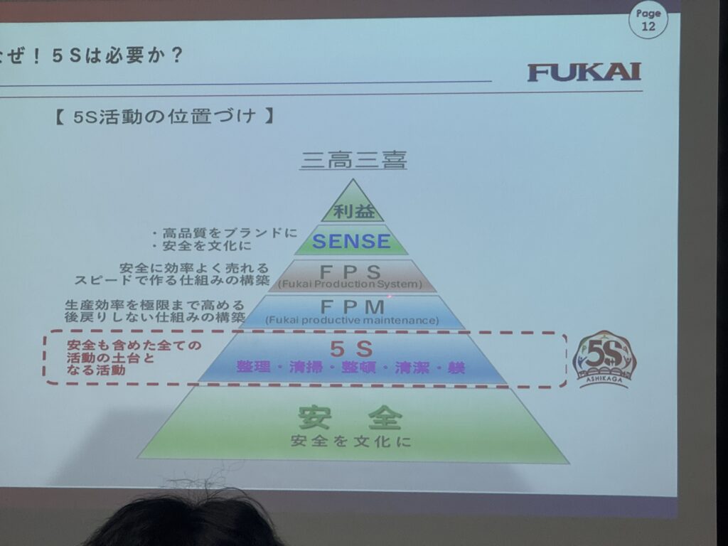 深井製作所様での5S位置づけは明確で、企業ベースとして「安全」があり、その上に「5S」その上に「FPS(フカイ・プロダクションシステム)」や(FPM)(フカイ・プロダクションメンテナンス)」最上位概念として、5か年中期経営計画である「S・E・N・S・E」が来ます。
